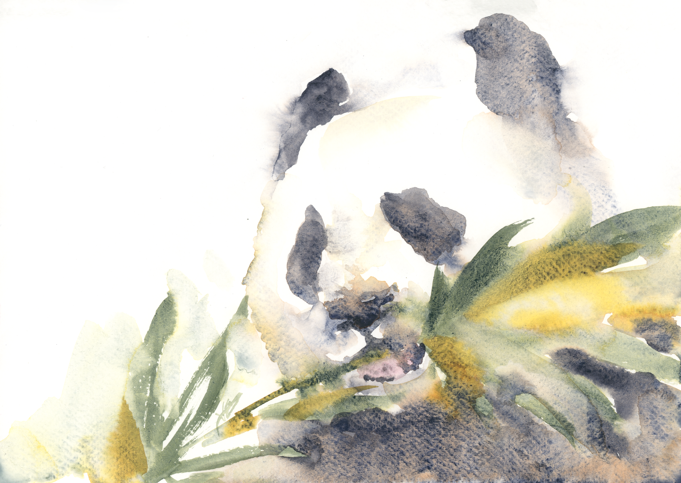 Once the face was in a good place, I moved on to the bamboo leaves using the Onat Diamond Yellow green. I kept the brushstrokes loose and let some of them run off the edge of the paper — when everything is too contained it starts to feel tight and fussy. A few strokes of Magic Wizard added some warmth and variation into the greens, because pure bright green can read a little flat on its own.